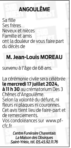 Décédé à Angoulême (16000) le vendredi 28 juin 2024