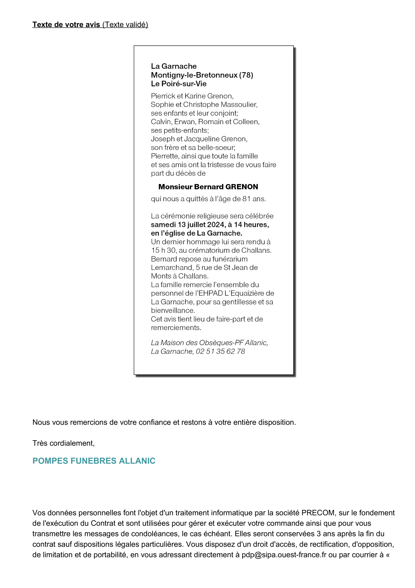 Cet espace « condoléances » est dédié à la mémoire de Monsieur Bernard GRENON.