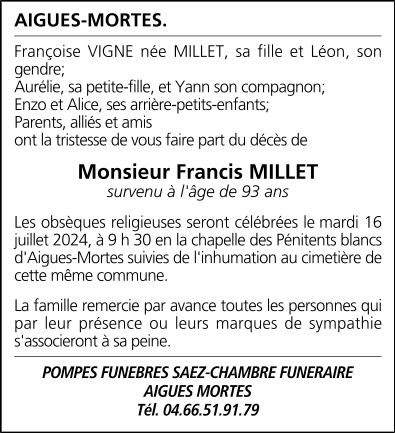 Cet espace « condoléances » est dédié à la mémoire de Monsieur Francis MILLET.