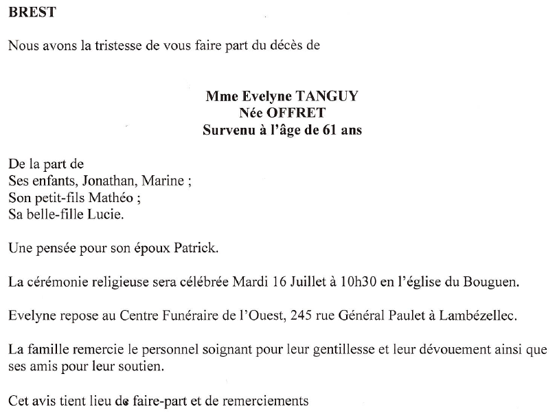 Cet espace « condoléances » est dédié à la mémoire de Madame Evelyne TANGUY née OFFRET.