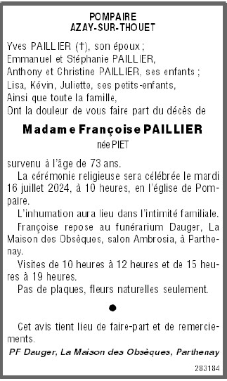 Cet espace « condoléances » est dédié à la mémoire de Madame Françoise PAILLIER née PIET.
