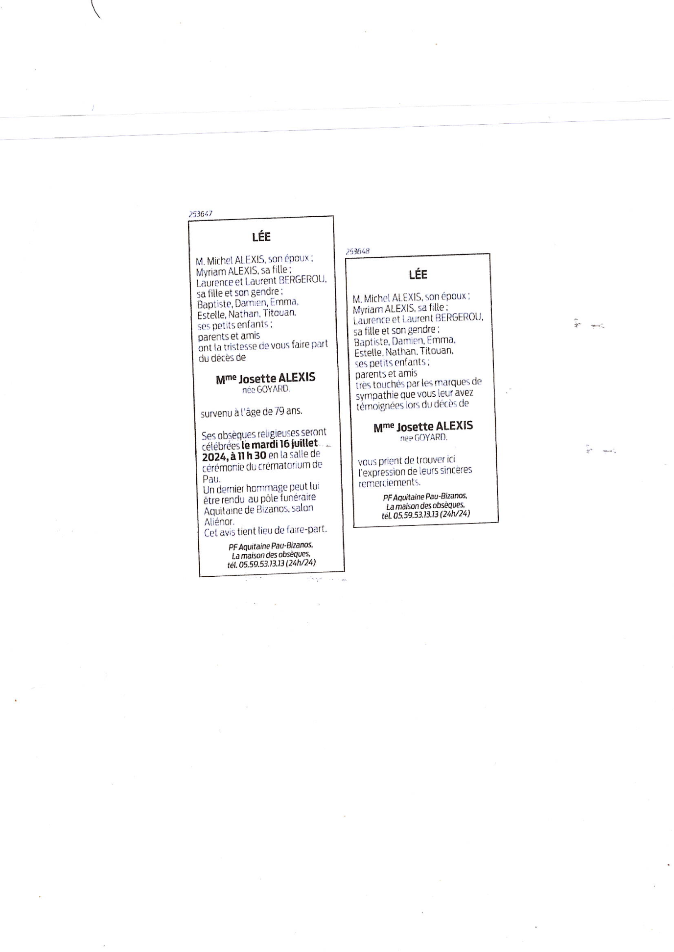de Madame Josette ALEXIS née GOYARD