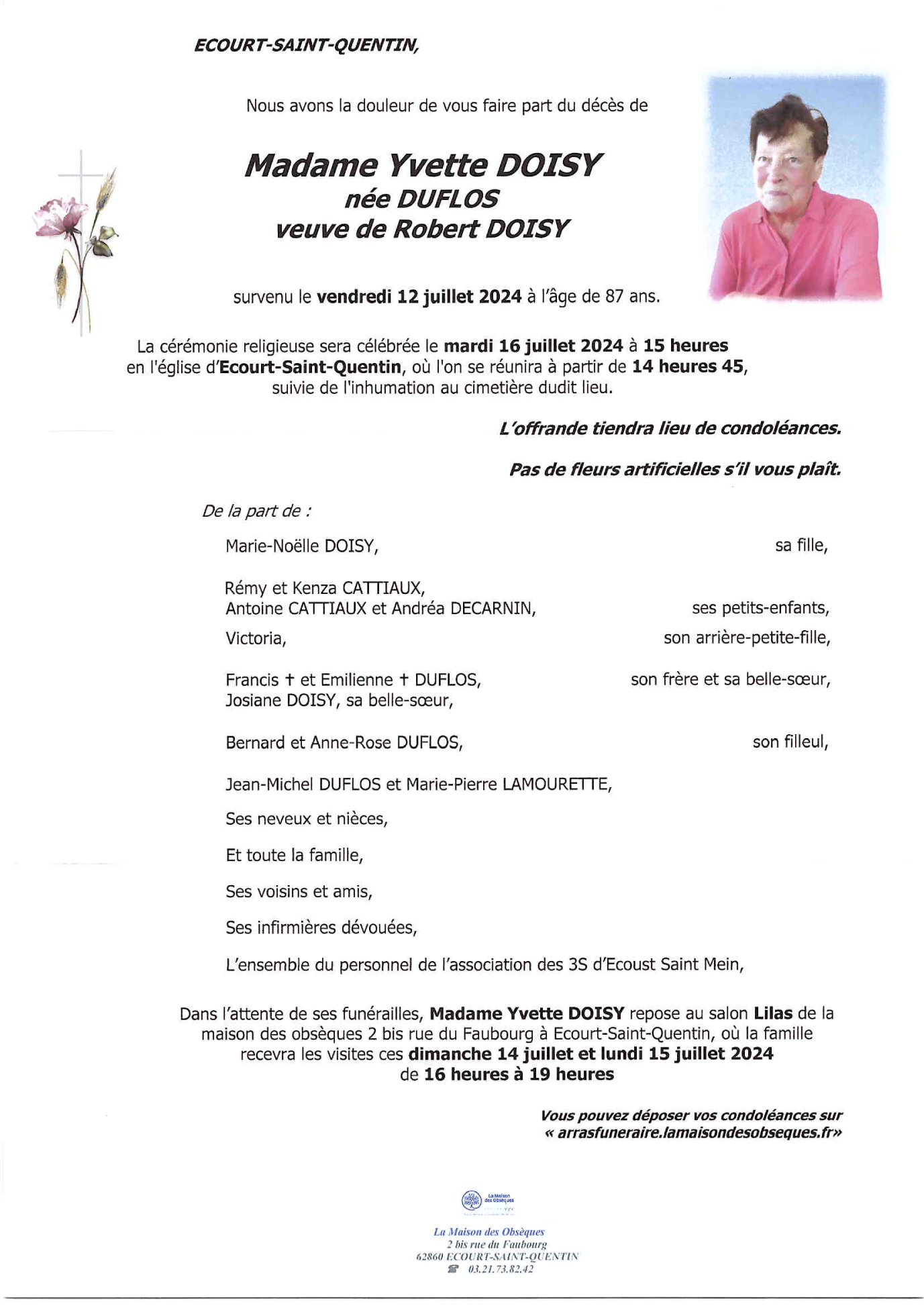 Cet espace « condoléances » est dédié à la mémoire de Madame Yvette DOISY née DUFLOS.