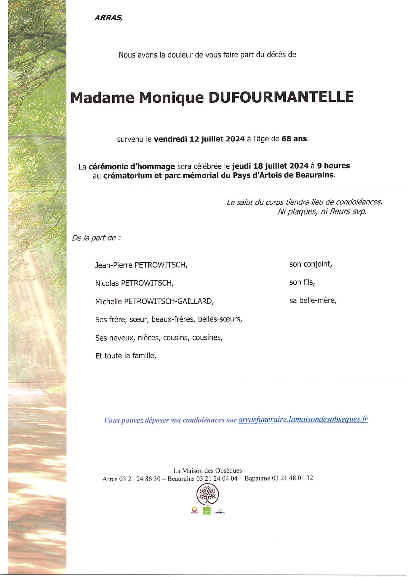 Cet espace « condoléances » est dédié à la mémoire de Madame Monique DUFOURMANTELLE.