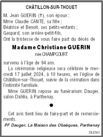 Cet espace « condoléances » est dédié à la mémoire de Madame Christiane GUERIN née CHAMPCOURT.