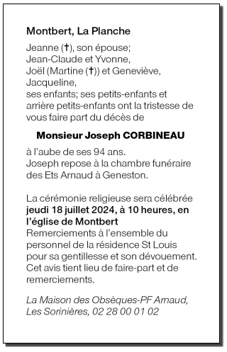 Cet espace « condoléances » est dédié à la mémoire de Monsieur Joseph CORBINEAU.