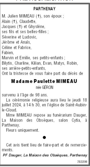 de Madame Paulette MIMEAU née GÉRON