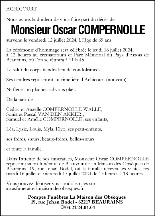Cet espace « condoléances » est dédié à la mémoire de Monsieur Oscar COMPERNOLLE.
