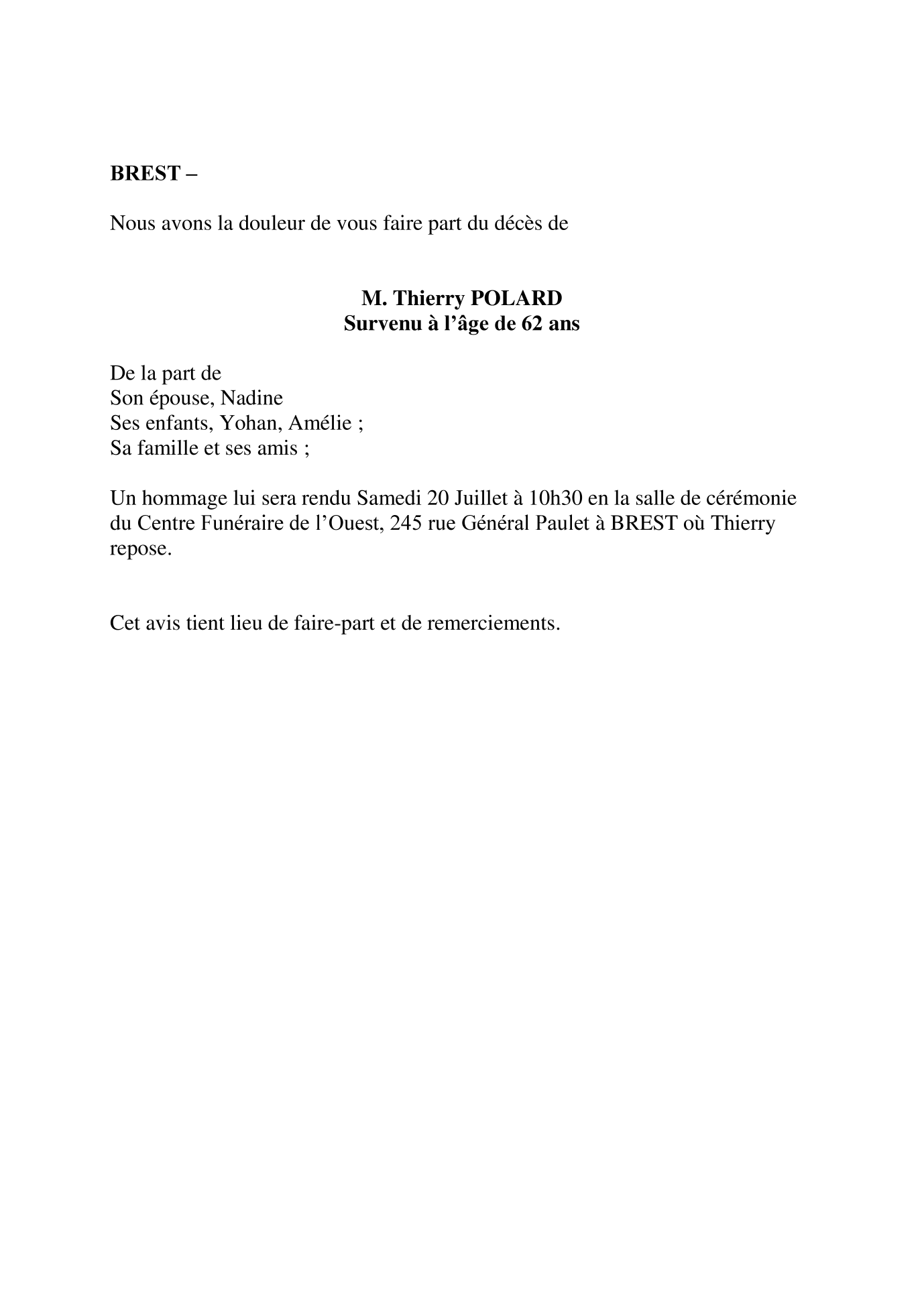 Cet espace « condoléances » est dédié à la mémoire de Monsieur Thierry POLARD.