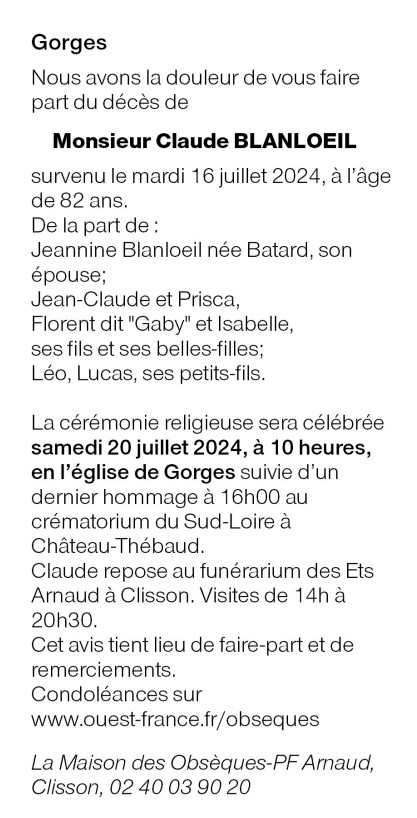 Cet espace « condoléances » est dédié à la mémoire de Monsieur Claude BLANLOEIL.