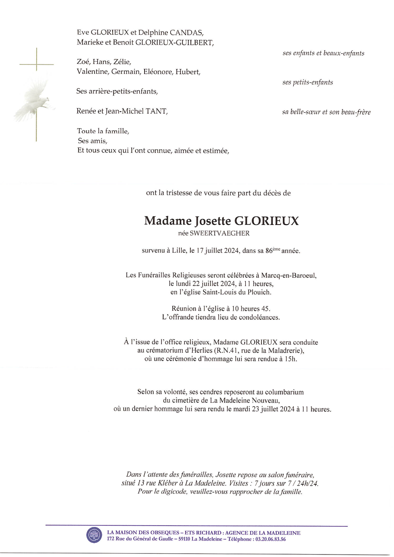 de Madame Josette GLORIEUX née SWEERTVAEGHER