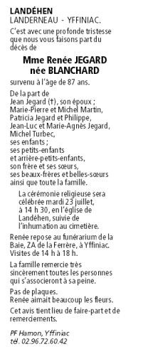 Cet espace « condoléances » est dédié à la mémoire de Madame Renée JEGARD née BLANCHARD.