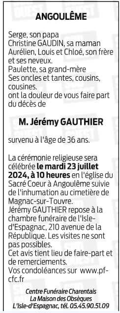 Cet espace « condoléances » est dédié à la mémoire de Monsieur Jérémy GAUTHIER.
