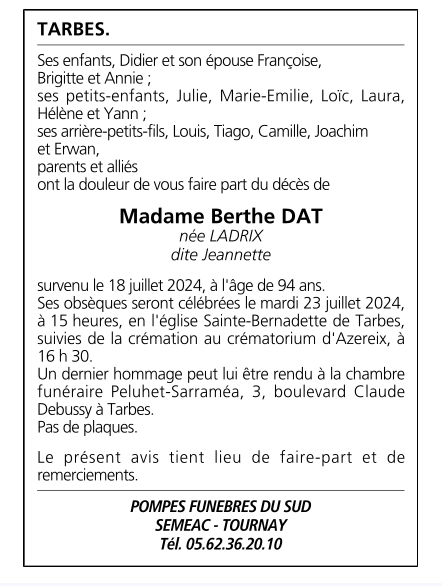 Cet espace « condoléances » est dédié à la mémoire de Madame Berthe DAT née LADRIX.