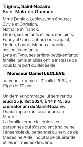 Cet espace « condoléances » est dédié à la mémoire de Monsieur Daniel LECLEVE.