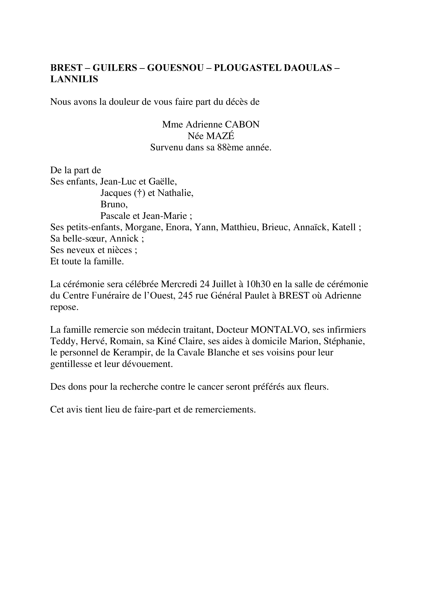 de Madame Adrienne CABON née MAZÉ