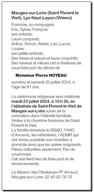 Décédé à Saint Florent le Vieil (49410) le samedi 20 juillet 2024