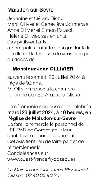 Cet espace « condoléances » est dédié à la mémoire de Monsieur Jean OLLIVIER.