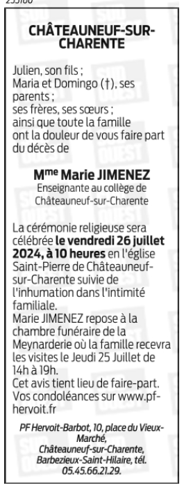 Décédée à Châteauneuf-sur-Charente (16120) le lundi 22 juillet 2024