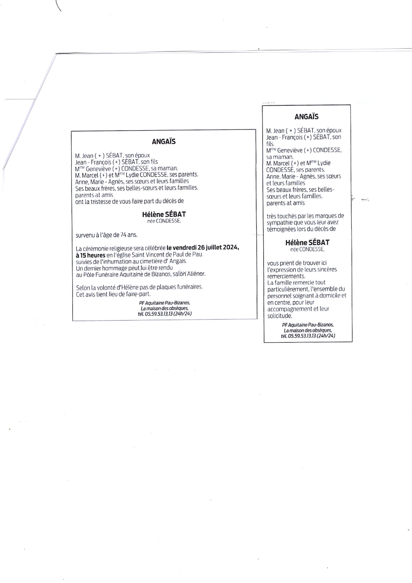 de Madame Hélène SÉBAT née CONDESSE