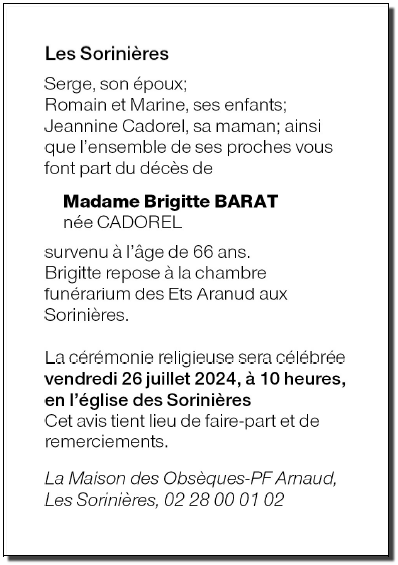 Cet espace « condoléances » est dédié à la mémoire de Madame Brigitte BARAT née CADOREL.