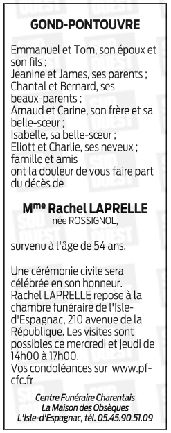 Cet espace « condoléances » est dédié à la mémoire de Madame Rachel LAPRELLE née ROSSIGNOL.