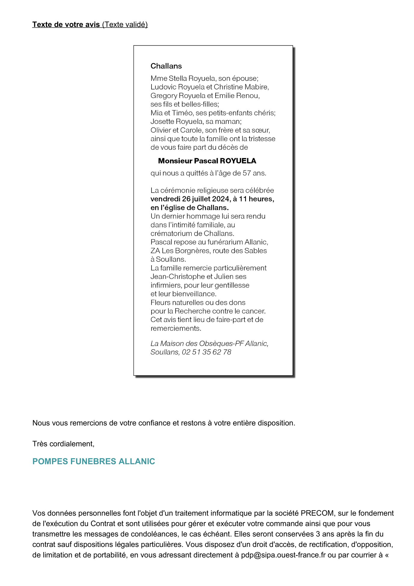 Cet espace « condoléances » est dédié à la mémoire de Monsieur Pascal ROYUELA.