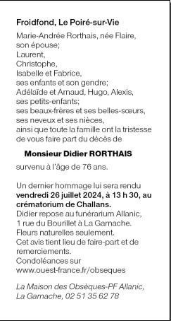 Décédé à Challans (85300) le mardi 23 juillet 2024
