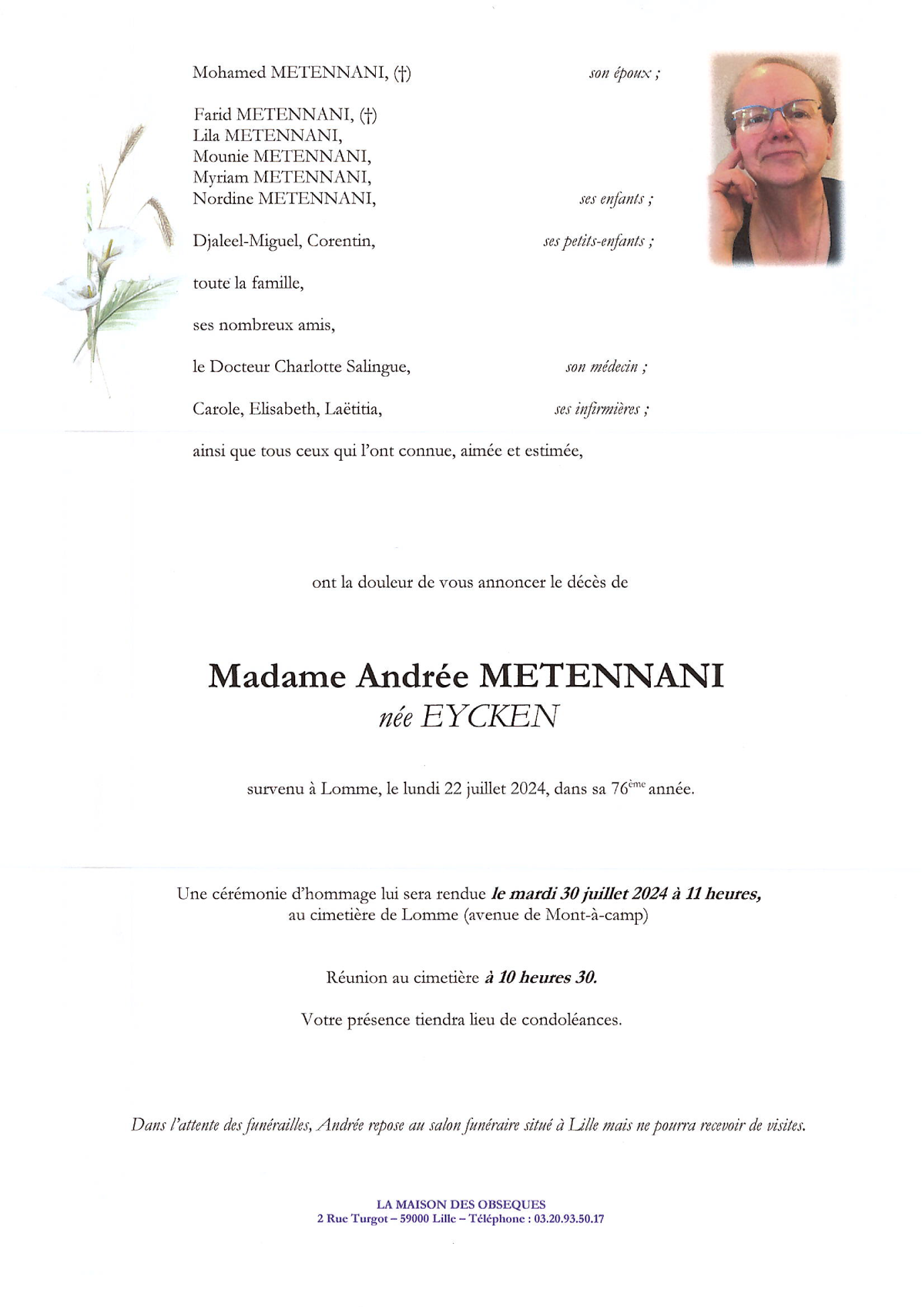 Cet espace « condoléances » est dédié à la mémoire de Madame Andrée METENNANI née EYCKEN.
