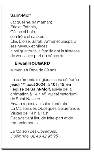 Cet espace « condoléances » est dédié à la mémoire de Monsieur Erwan HOUGARD.