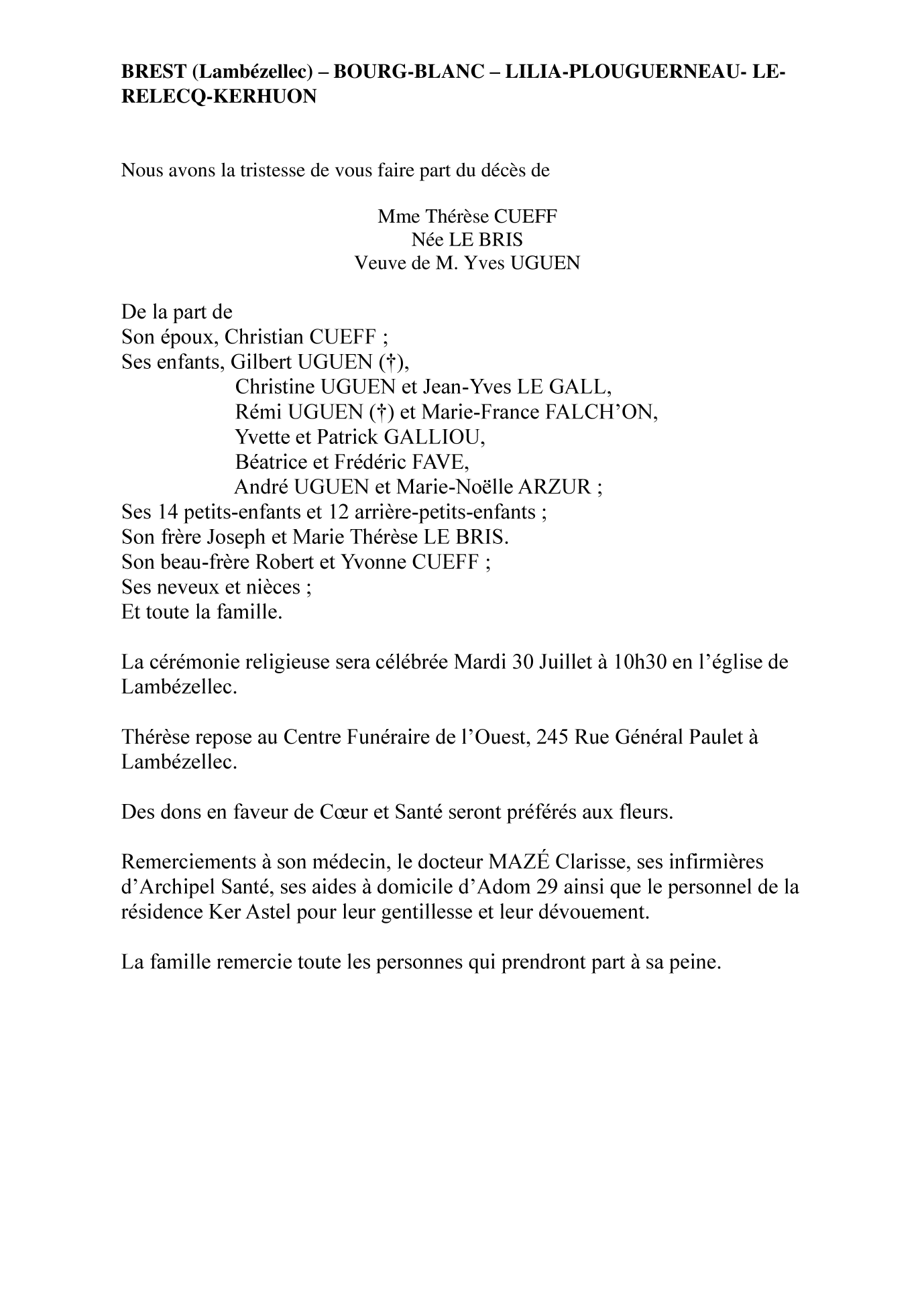 Cet espace « condoléances » est dédié à la mémoire de Madame Thérèse CUEFF née LE BRIS.