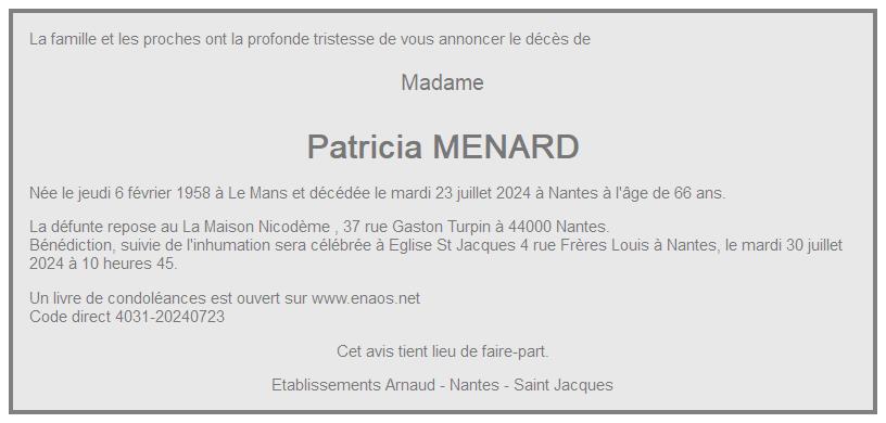 Cet espace « condoléances » est dédié à la mémoire de Madame Patricia MENARD.