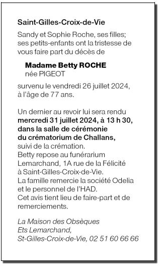 Cet espace « condoléances » est dédié à la mémoire de Madame Elisabeth ROCHE née PIGEOT.
