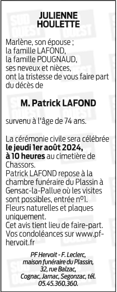 Cet espace « condoléances » est dédié à la mémoire de Monsieur Patrick LAFOND.