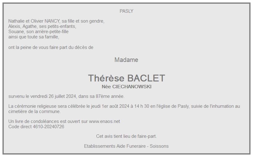 de Madame Thérèse BACLET née CIECHANOWSKI