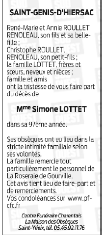 Cet espace « condoléances » est dédié à la mémoire de Madame SIMONE LOTTET.