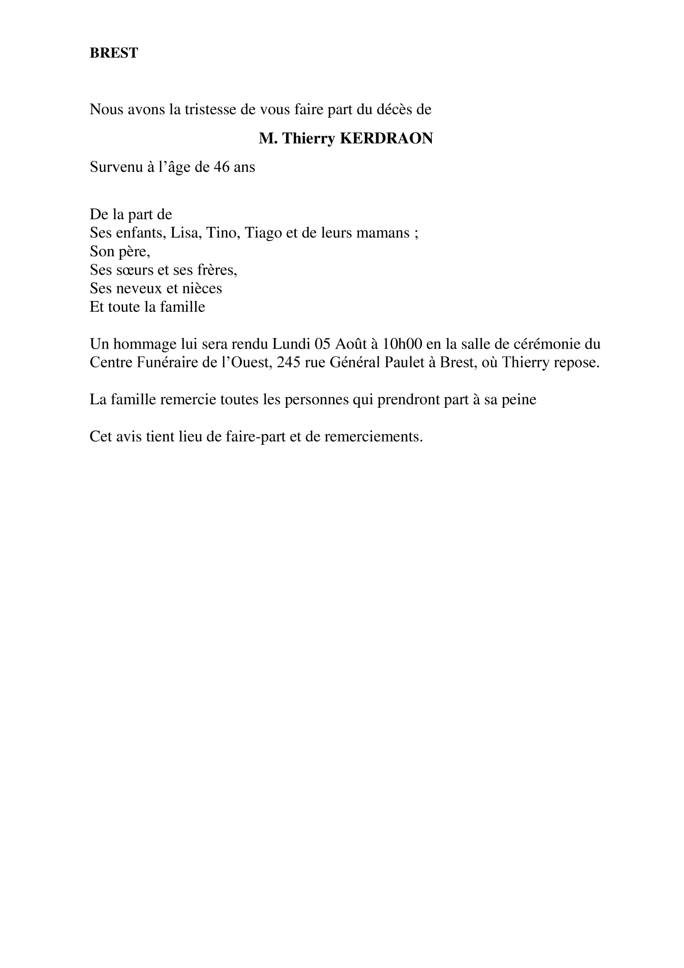 Cet espace « condoléances » est dédié à la mémoire de Monsieur Thierry KERDRAON.