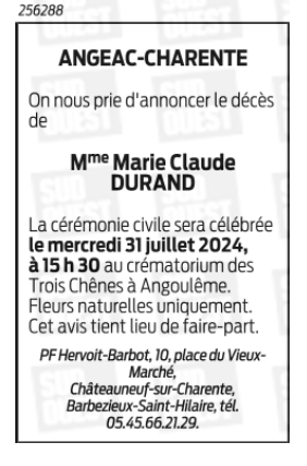 Décédée à Châteaubernard (16100) le dimanche 28 juillet 2024