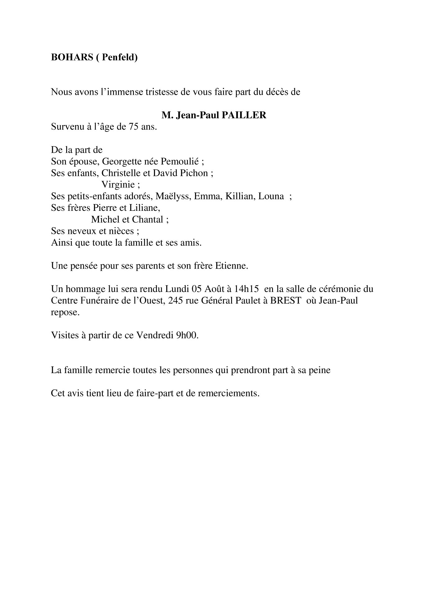 Cet espace « condoléances » est dédié à la mémoire de Monsieur Jean-Paul PAILLER.