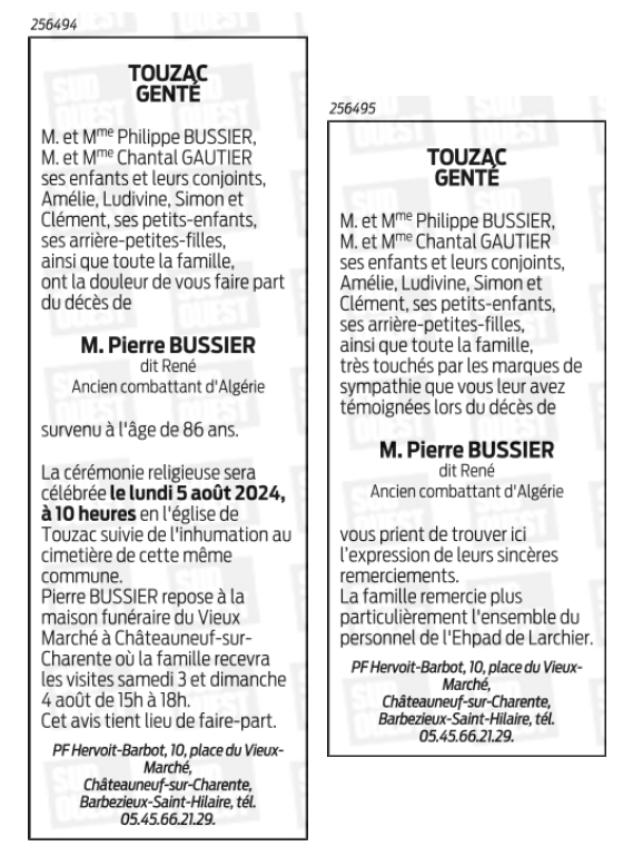 Cet espace « condoléances » est dédié à la mémoire de Monsieur Pierre René BUSSIER.