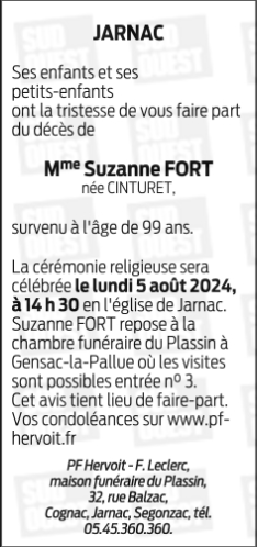 Cet espace « condoléances » est dédié à la mémoire de Madame Suzanne FORT née CINTURET.