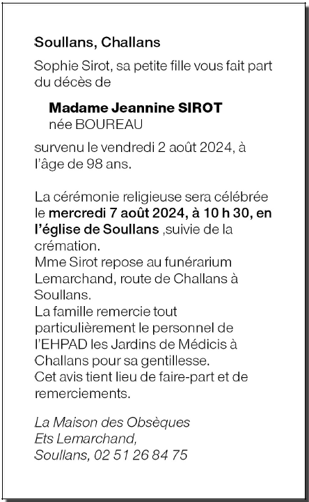 Cet espace « condoléances » est dédié à la mémoire de Madame Jeannine SIROT née BOUREAU.