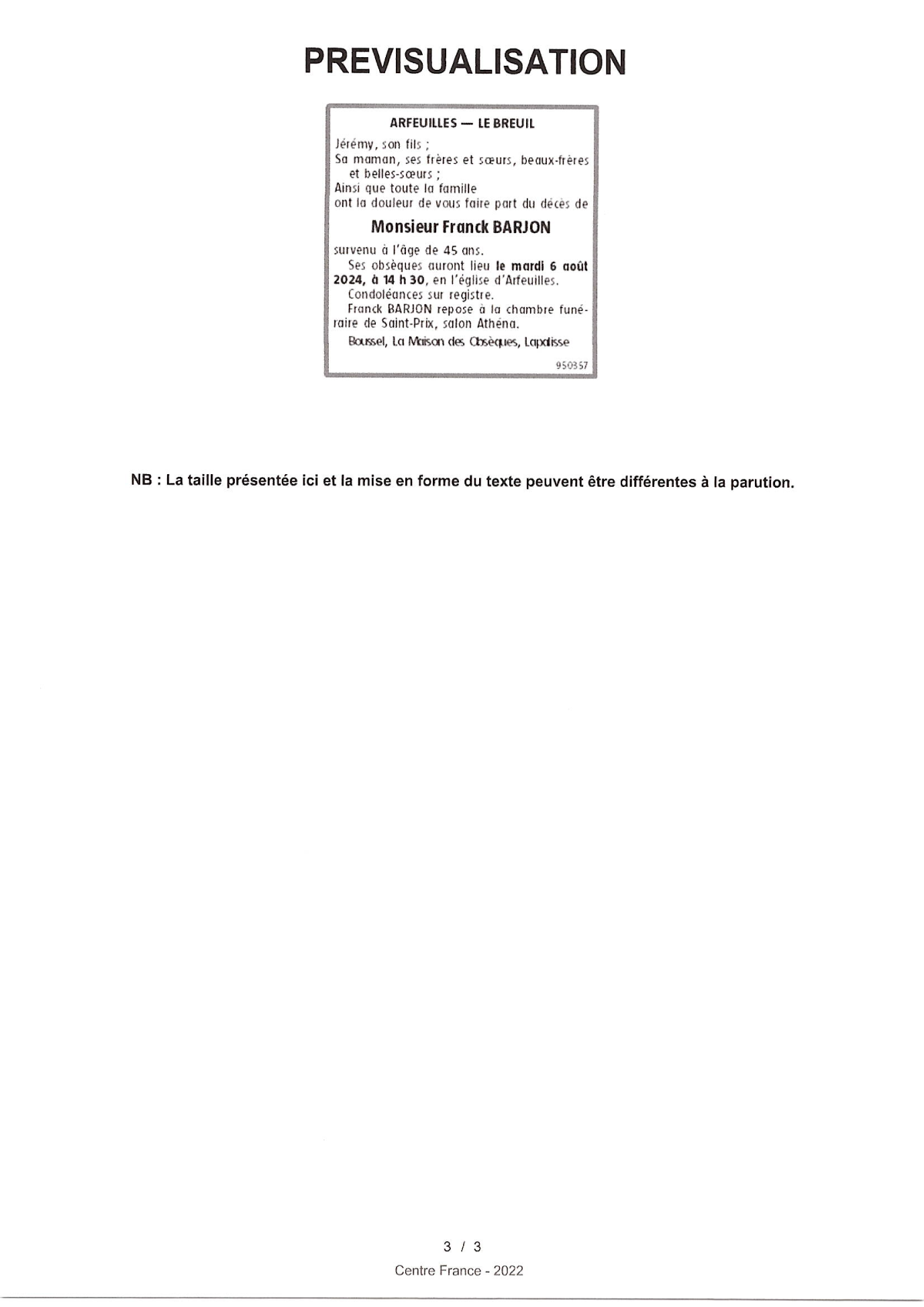Cet espace « condoléances » est dédié à la mémoire de Monsieur Franck BARJON.