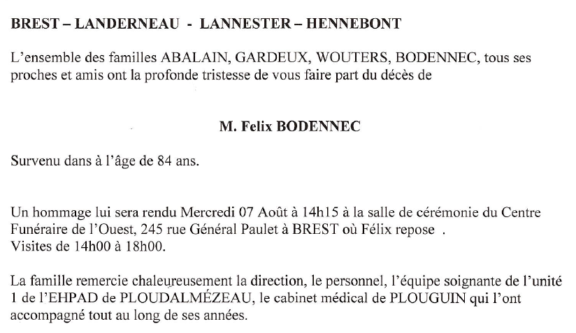 Cet espace « condoléances » est dédié à la mémoire de Monsieur Félix BODENNEC.
