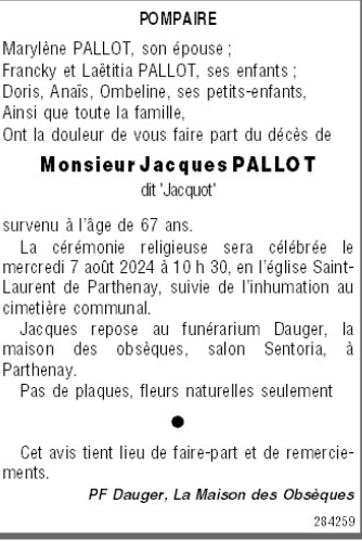 Cet espace « condoléances » est dédié à la mémoire de Monsieur Jacques PALLOT.