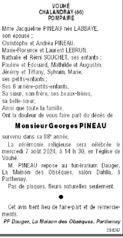 Cet espace « condoléances » est dédié à la mémoire de Monsieur Georges PINEAU.