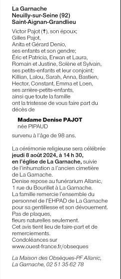 de Madame Denise PAJOT née PIPAUD
