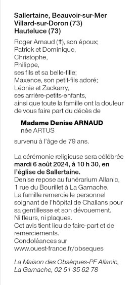 Cet espace « condoléances » est dédié à la mémoire de Madame Denise ARNAUD née ARTUS.