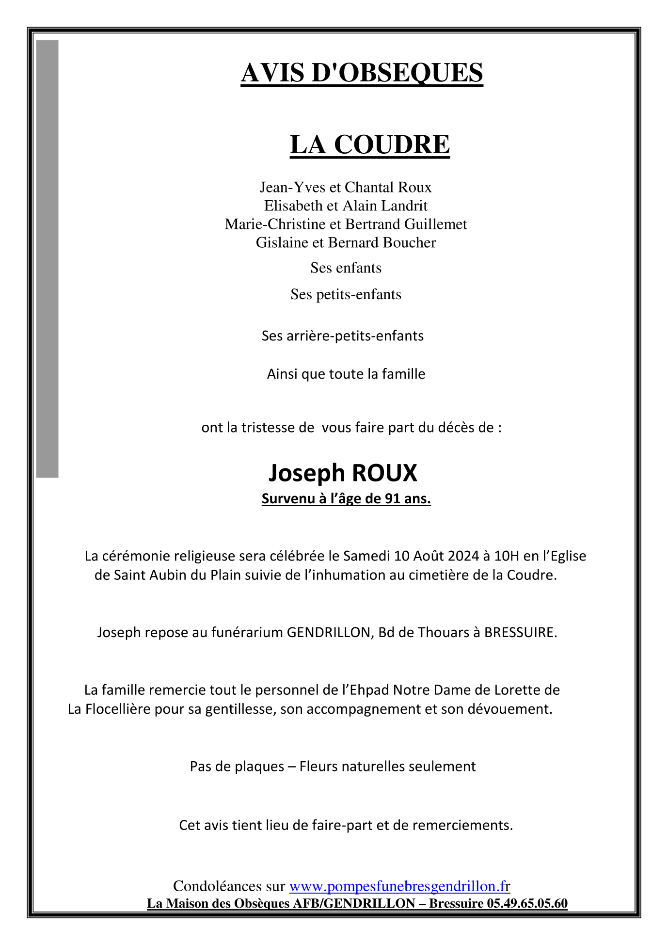 Cet espace « condoléances » est dédié à la mémoire de Monsieur Joseph ROUX.