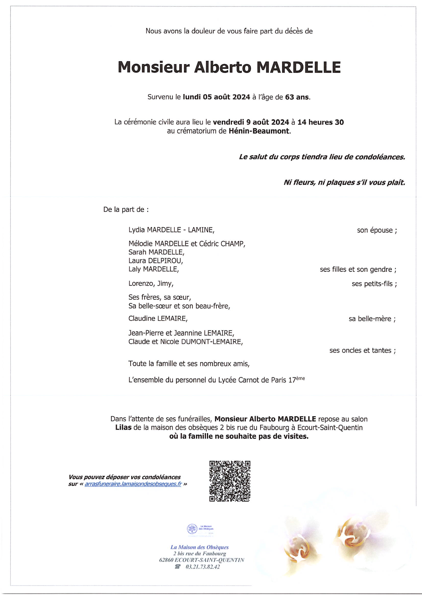 Cet espace « condoléances » est dédié à la mémoire de Monsieur Alberto MARDELLE.